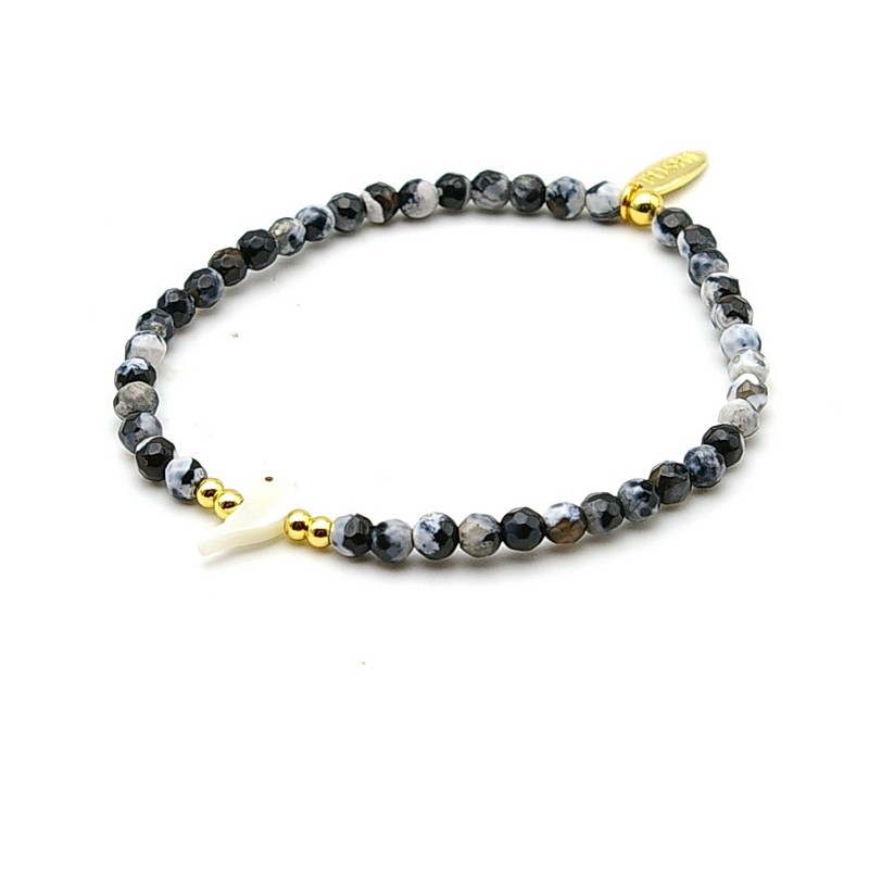 Armband 4mm halfedelsteen Agaat zwart/wit met parelmoer vogeltje