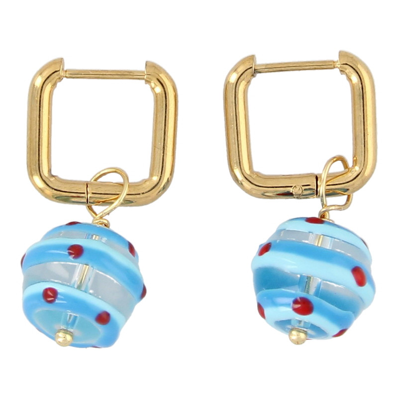 Oorbellen creool vierkant met glaskraal bol blauw