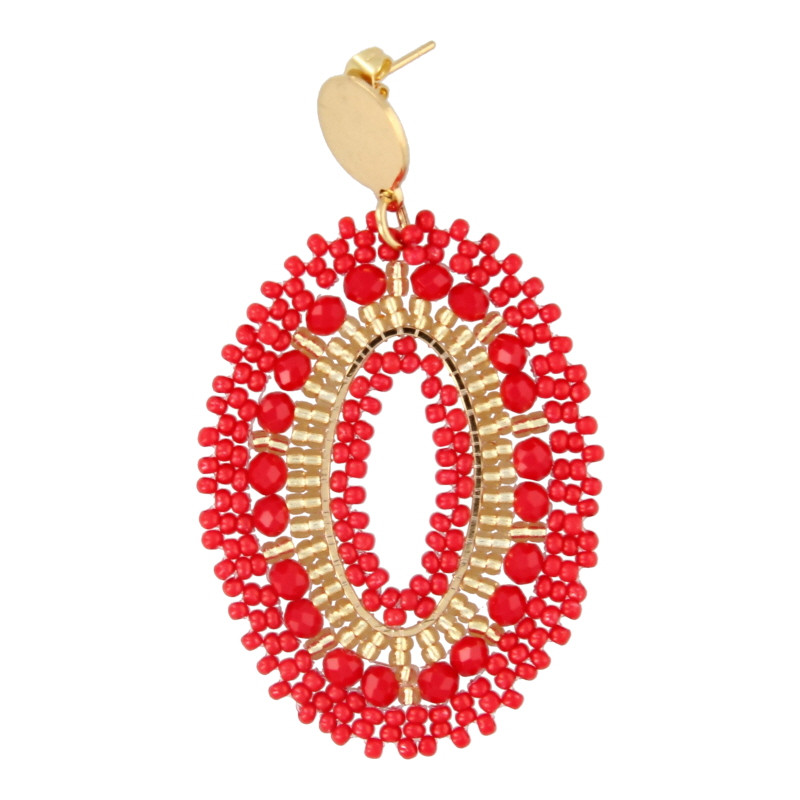Oorbellen ovaal met glaskraaltjes goud en rood
