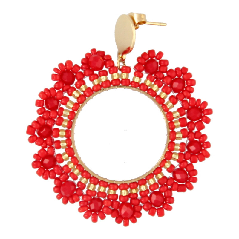 Oorbellen rond bloemetjes met glaskraaltjes rood en goud