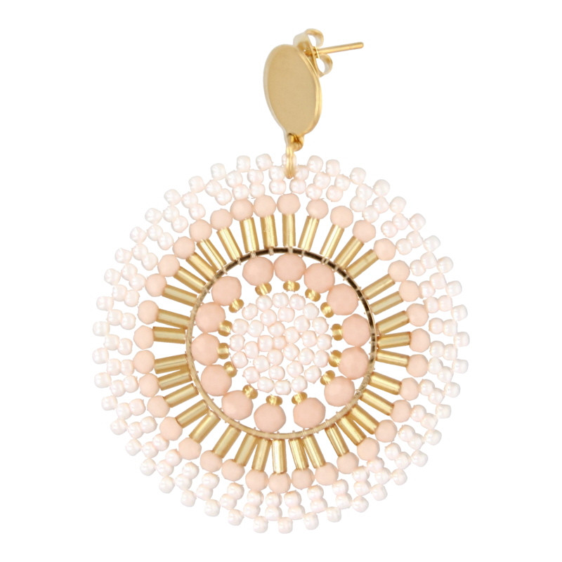 Oorbellen rond met facetkralen beige en glaskraaltjes beige en parelmoer