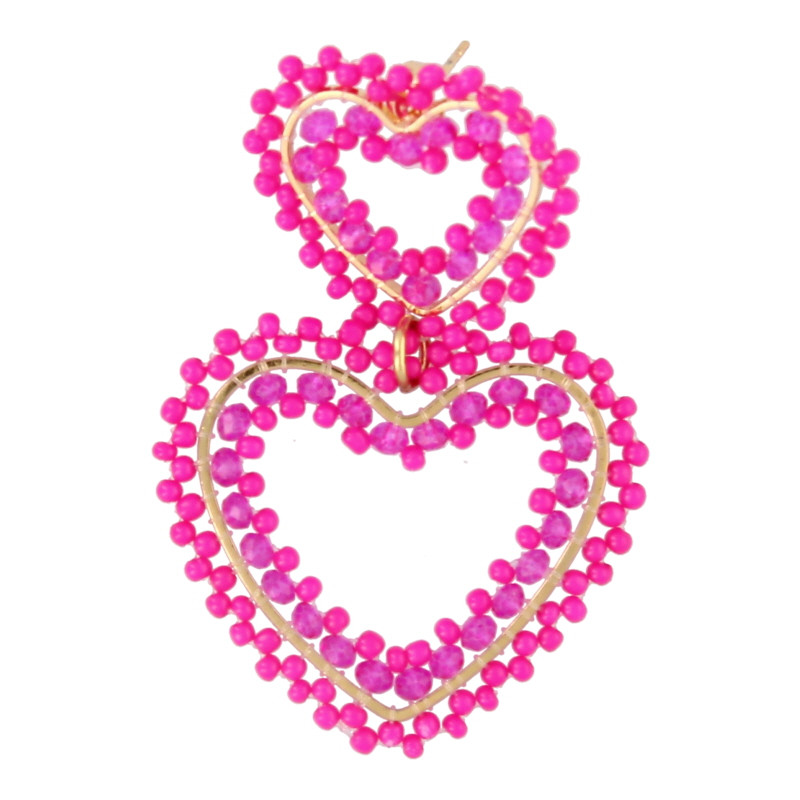 Oorbellen hartje dubbel met facetkralen fuchsia