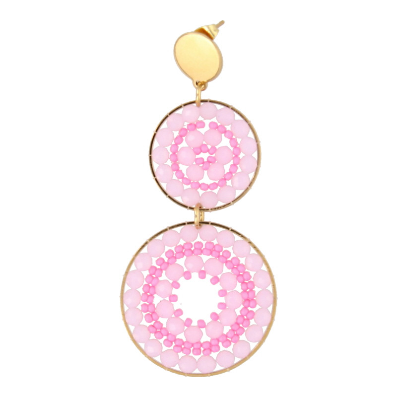 Oorbellen rond dubbel met facetkralen zachtroze en glaskraaltjes roze