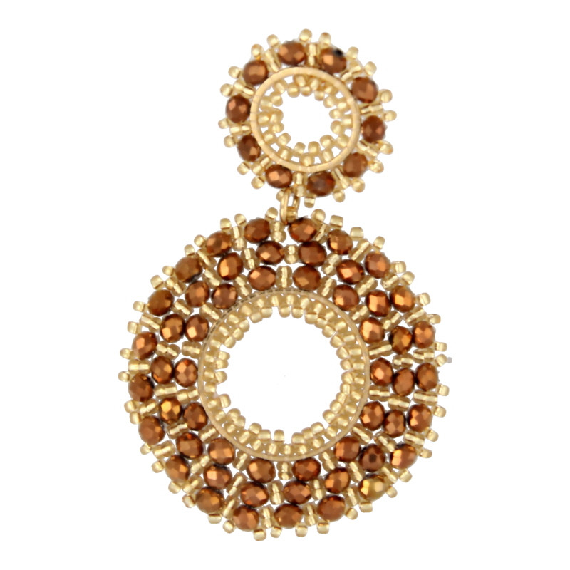 Oorbellen rond dubbel met facetkralen brons en glaskraaltjes goud