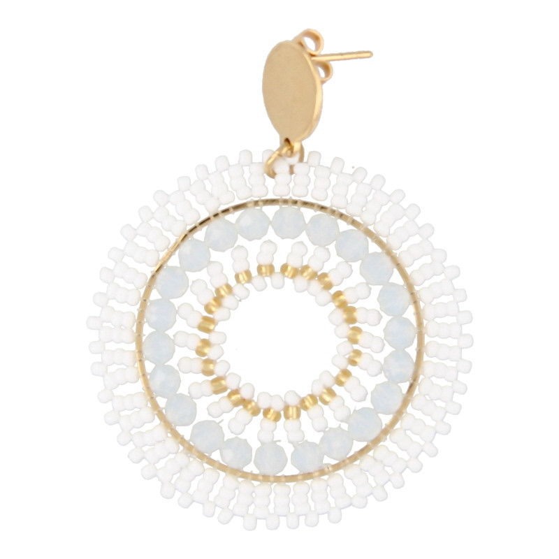 Oorbellen rond met facetkralen melkwit en glaskraaltjes wit en goud