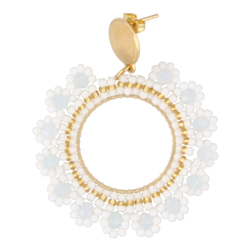 Oorbellen rond met facetkralen melkwit en glaskraaltjes wit en goud