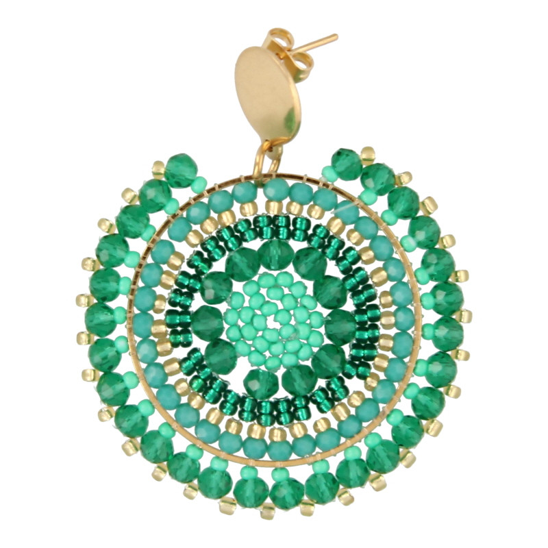Oorbellen geweven rond met facetkralen petrol en zeegroen