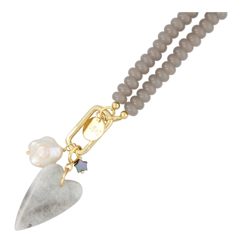 Materiaal: glaskralen en halfedelsteen en metalen bedels