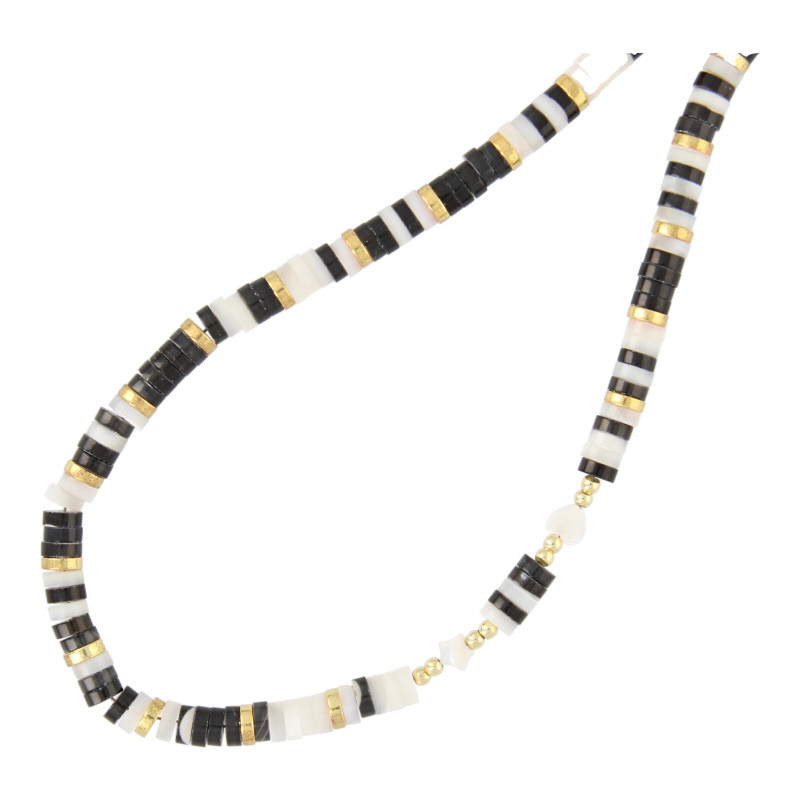Ketting schelp schijfjes zwart/wit en goud schelp sterretjes