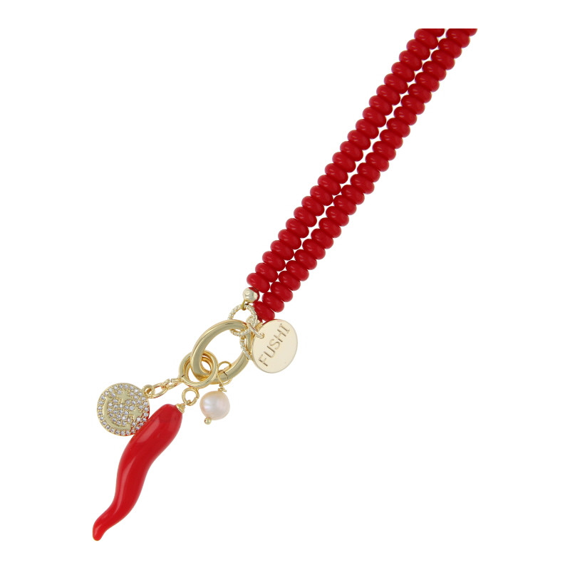 Ketting halfedelsteen donut 4x6mm rood met clip en bedels