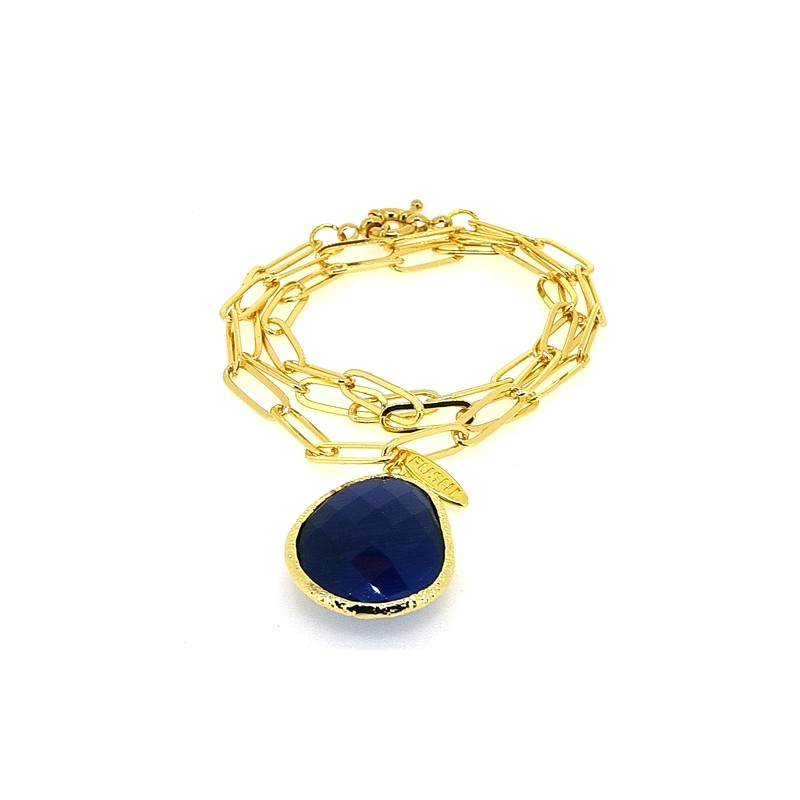 Ketting metaal goud schakel met facetgeslepen ovale glashanger donkerblauw