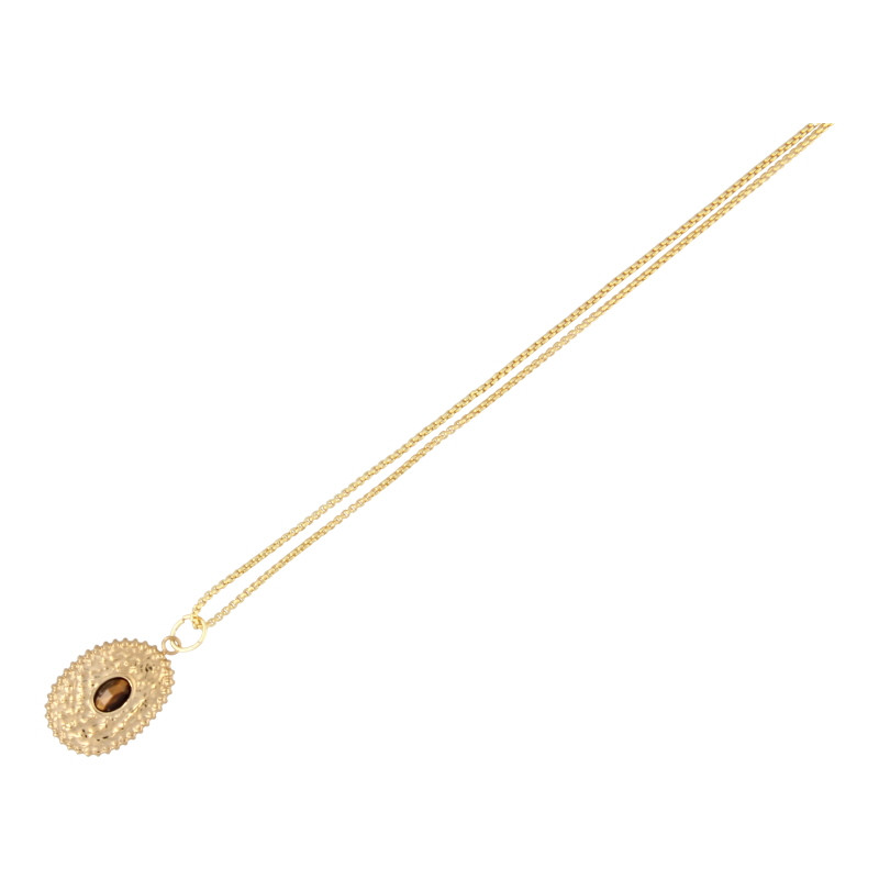 Ketting metaal stainless steel met ronde gouden hanger en tigereye steentje