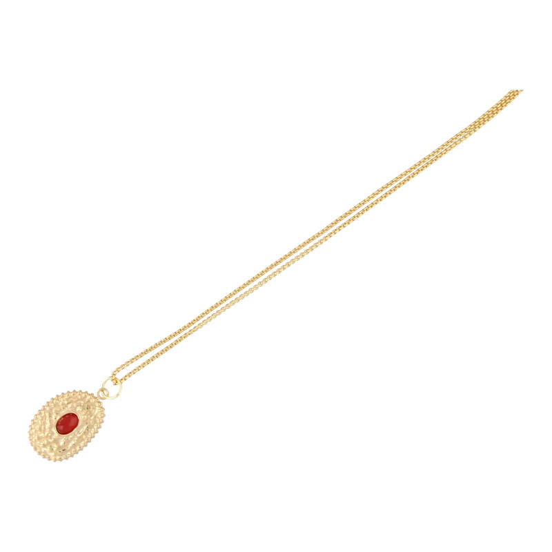 Ketting metaal stainless steel met ronde gouden hanger en agaat oranje steentje